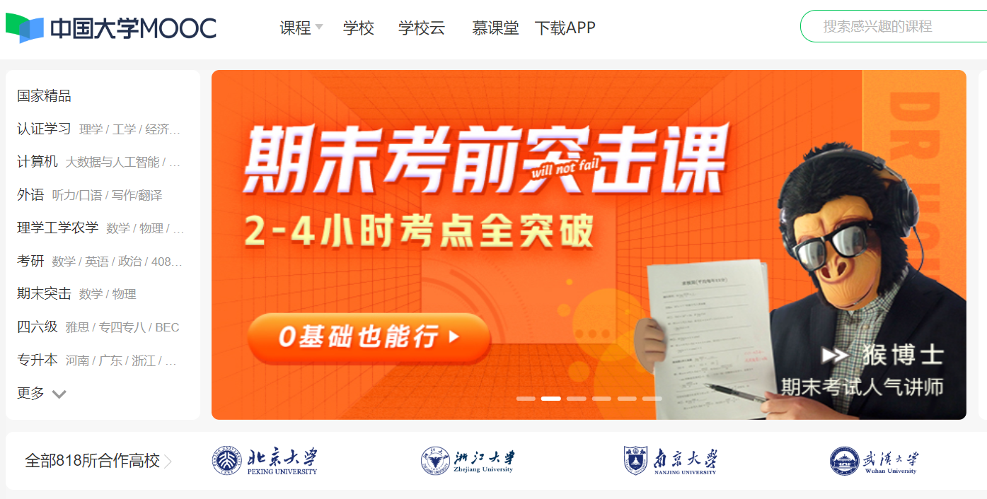 提供中国知名高校的MOOC课程,涵盖会计、建筑、外语、学历、留学、职业、医学等多个领域。
