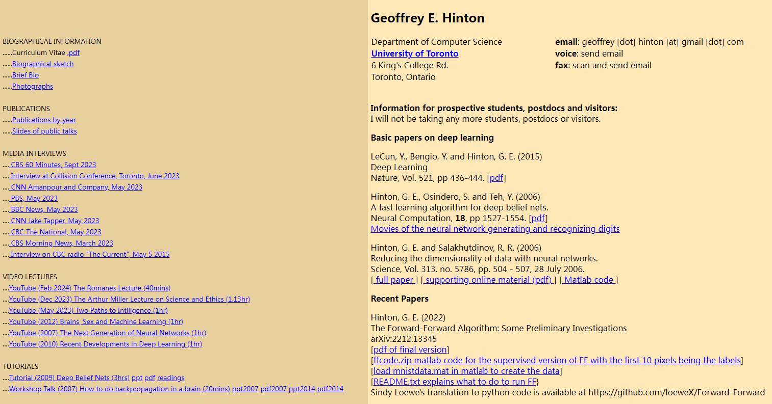 https://www.cs.toronto.edu/~hinton/ 是 Geoffrey Hinton 教授的个人主页,他是加拿大多伦多大学的计算机科学教授,也是深度学习领域的先驱之一。