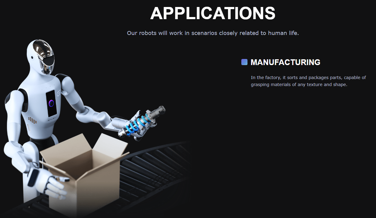 制造领域:在工厂中,Galbot机器人能够对零件进行分类和包装,能够抓取任何质地和形状的材料。