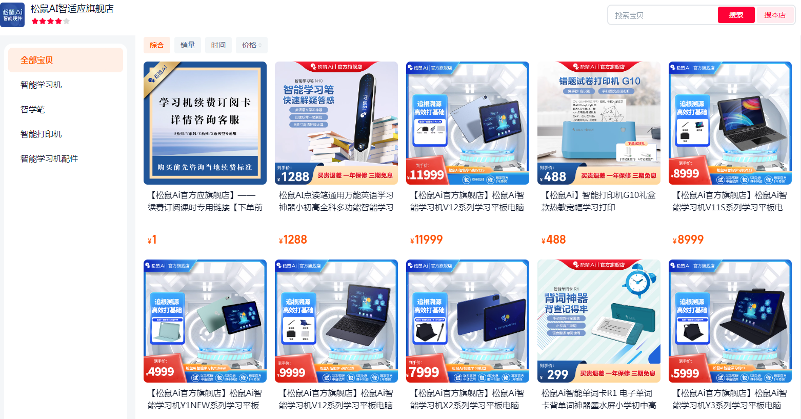 松鼠AI智适应旗舰店是天猫平台上的一家店铺,专注于销售松鼠AI品牌的智能学习产品。