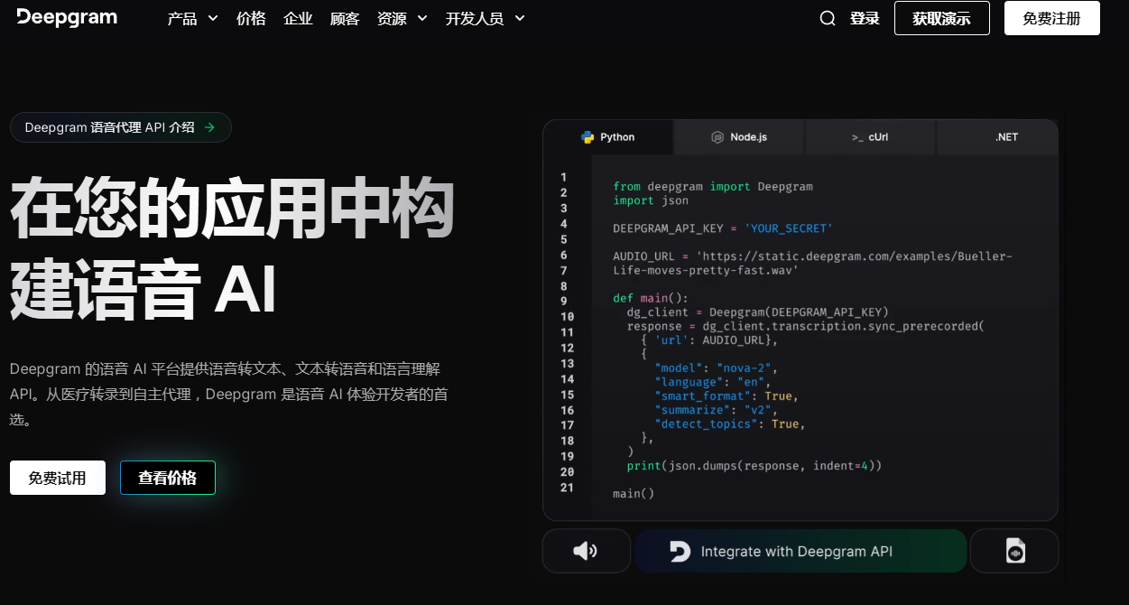 Deepgram 是一个提供语音到文本、文本到语音以及语言理解 API 的语音 AI 平台。它被全球顶尖企业、对话式 AI 领导者和初创公司所信赖,适用于医疗转录到自主代理等多种场景。