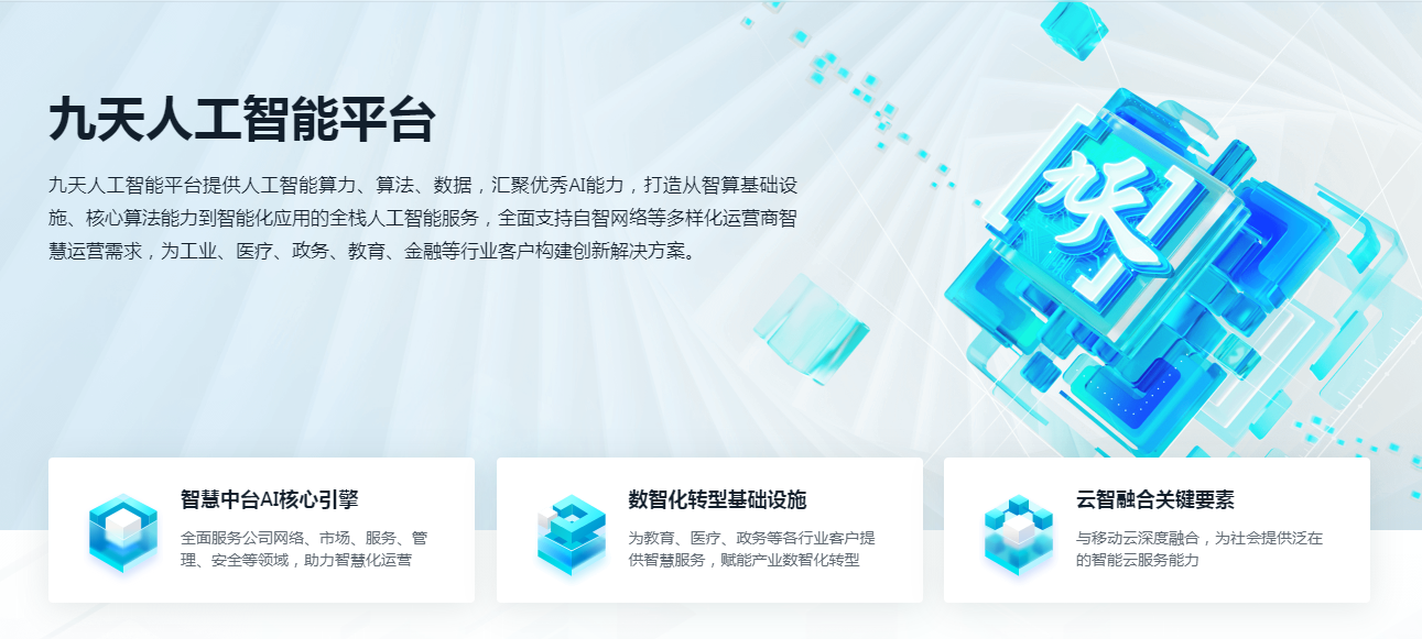 九天人工智能平台是中国移动推出的一个综合性人工智能服务平台,旨在提供算力、算法、数据等AI能力,支持多样化的运营商智慧运营需求,并为各行业客户提供创新解决方案。