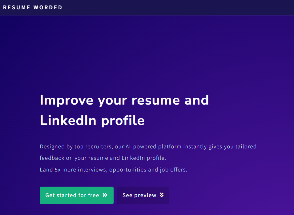Resume Worded 不仅仅是另一个简历生成器或检查器。这是一份个人简历和 LinkedIn 教练,可为您提供有关如何优化求职漏斗的个性化和可操作的建议。无论您是学生、专业人士还是转行者,Resume Worded 都可以通过脱颖而出的简历和个人资料帮助您在职业生涯中取得成功。
