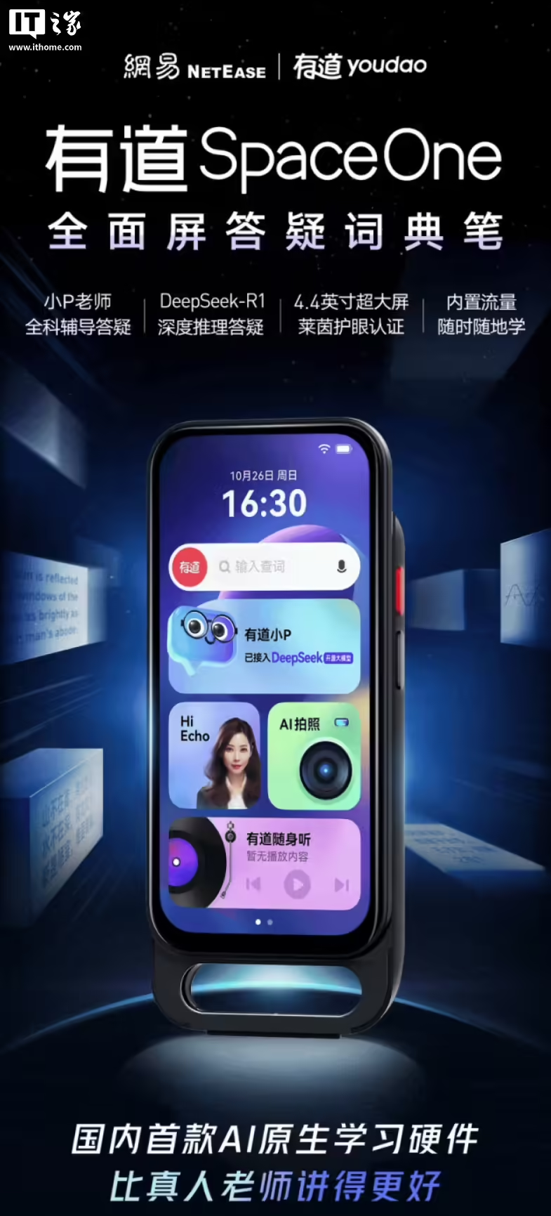 全面屏答疑词典笔SpaceOne是由网易有道推出的国内首款AI原生学习硬件,融合DeepSeek-R1推理模型,提供深度答疑辅导,助力学生高效学习。