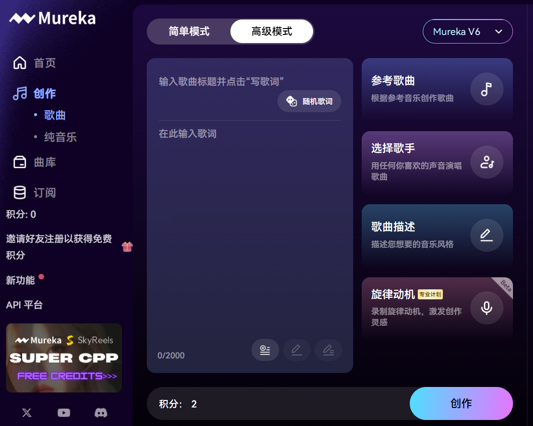 访问Mureka官网,选择相应的创作模式(如歌词创作、旋律创作等)。