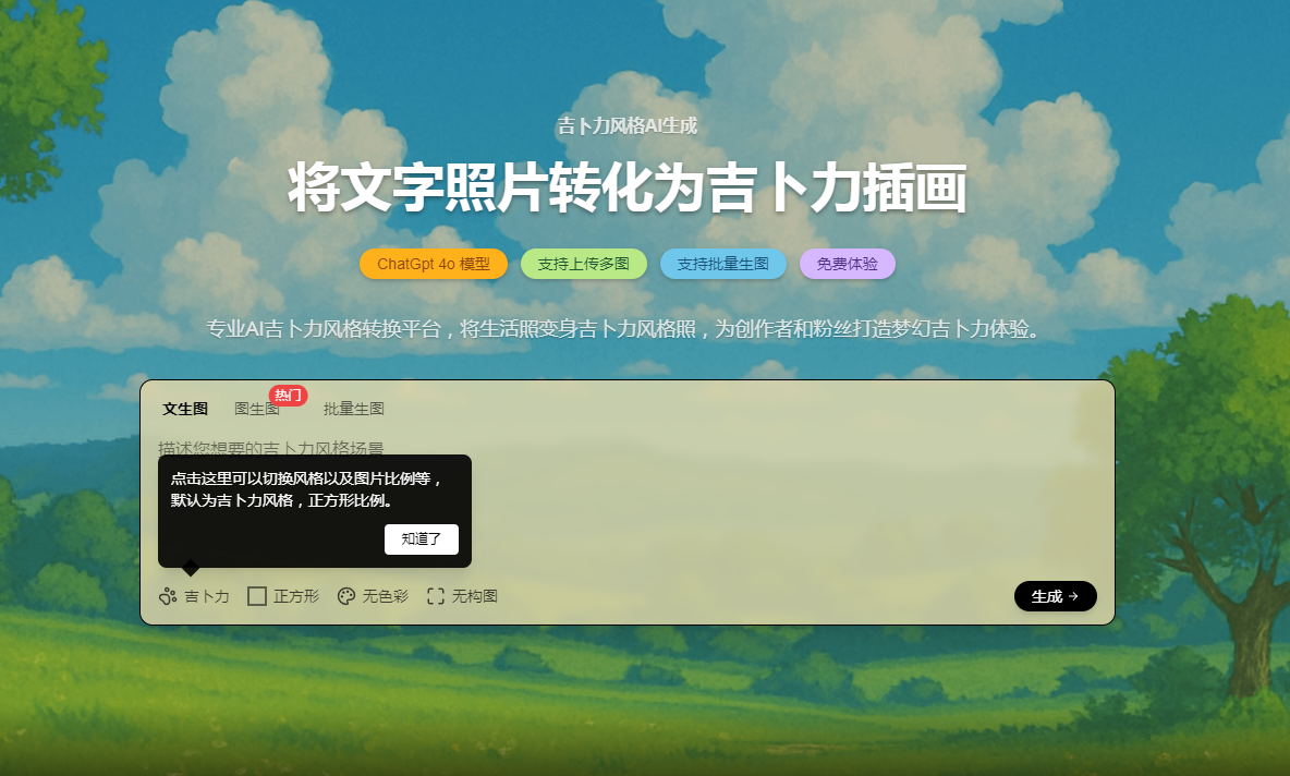 文本生成图像:用户可以通过详细的文本描述生成对应的吉卜力风格插画。