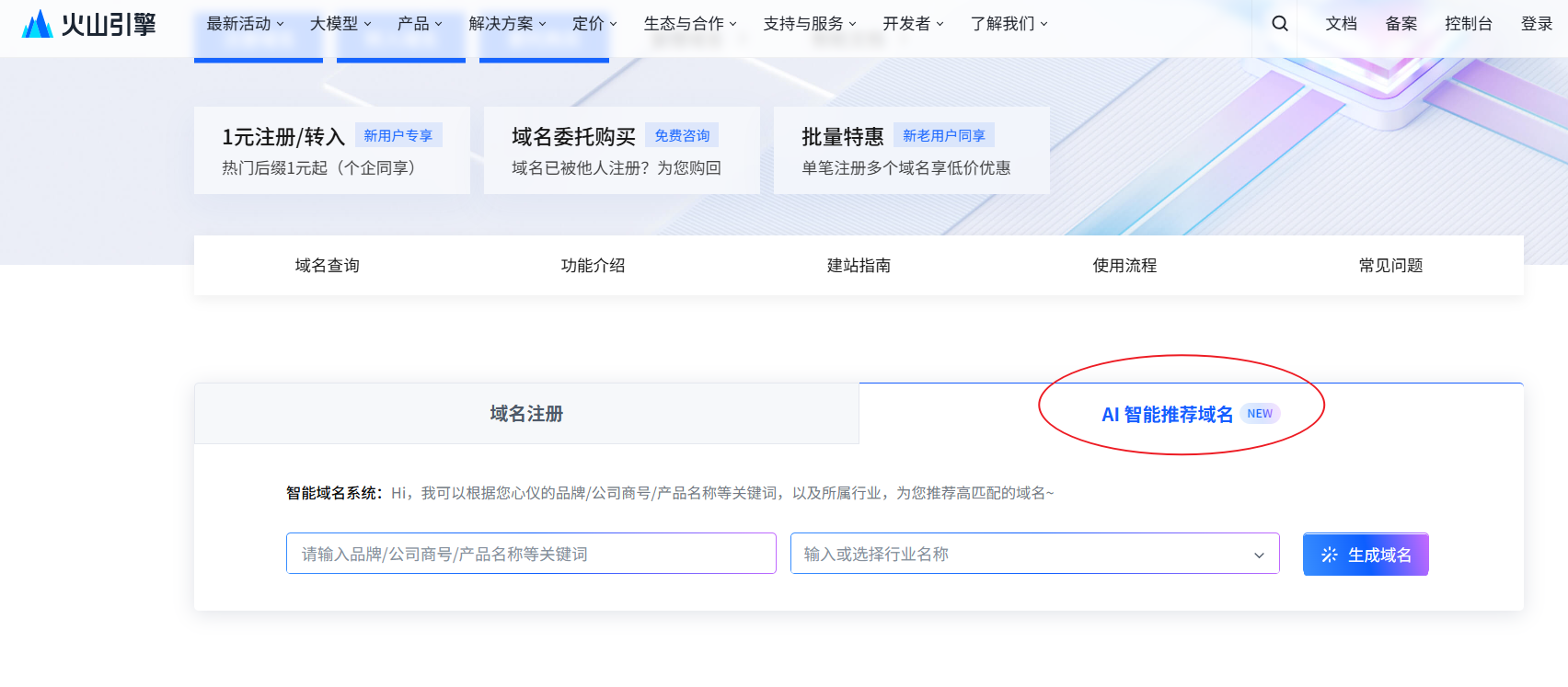 火山引擎“AI 智能推荐域名”功能是一款基于火山引擎方舟大模型的智能域名推荐工具,旨在帮助用户快速高效地找到理想的域名。