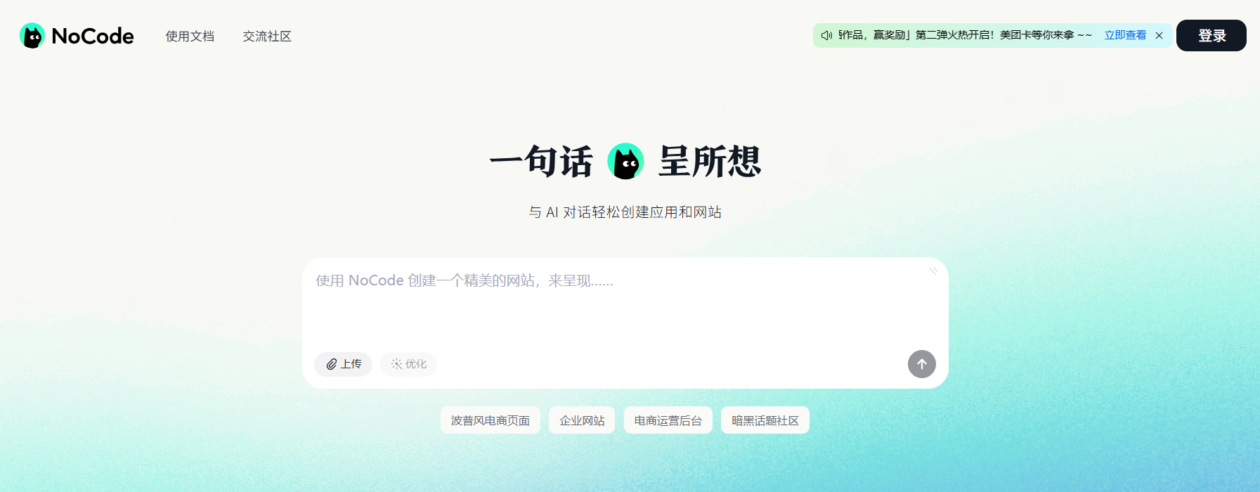 美团NoCode是一款由美团研发质量与效率团队打造的零代码AI应用开发平台,通过自然语言交互,用户无需编程经验即可快速生成应用。