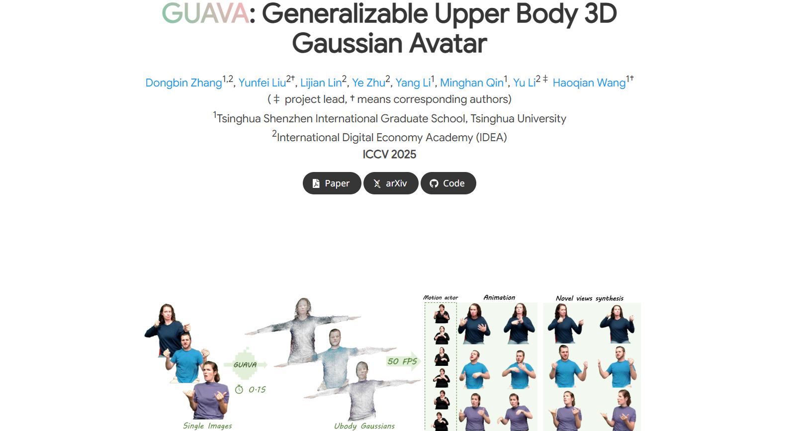 GUAVA 是由清华大学深圳国际研究生院和 IDEA 联合提出的用于快速可动画的上半身 3D 高斯形象重建框架。