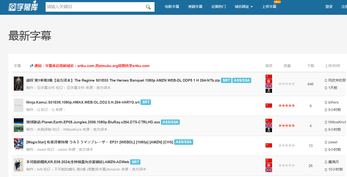 字幕库zimuku是一个专业的超级丰富的影视字幕网站及字幕下载平台,提供了海量的电影、电视剧、动漫、纪录片等视频的中英双语字幕,包含了国内外的电影和电视剧等影视字幕资源。字幕库的字幕都是由热心的网友或字幕组制作和分享的,质量高,更新快,覆盖了各种流行的视频资源。字幕库的目标是为广大的影视爱好者提供方便、快捷、优质的字幕服务。