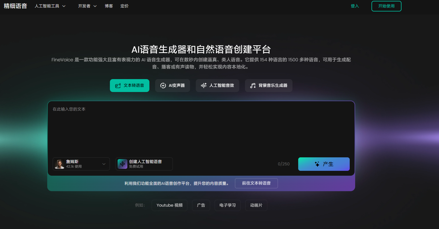 访问FineVoice官网,使用邮箱、Google或苹果账号注册,新用户自动获得每月2000个TTS字符的免费额度。