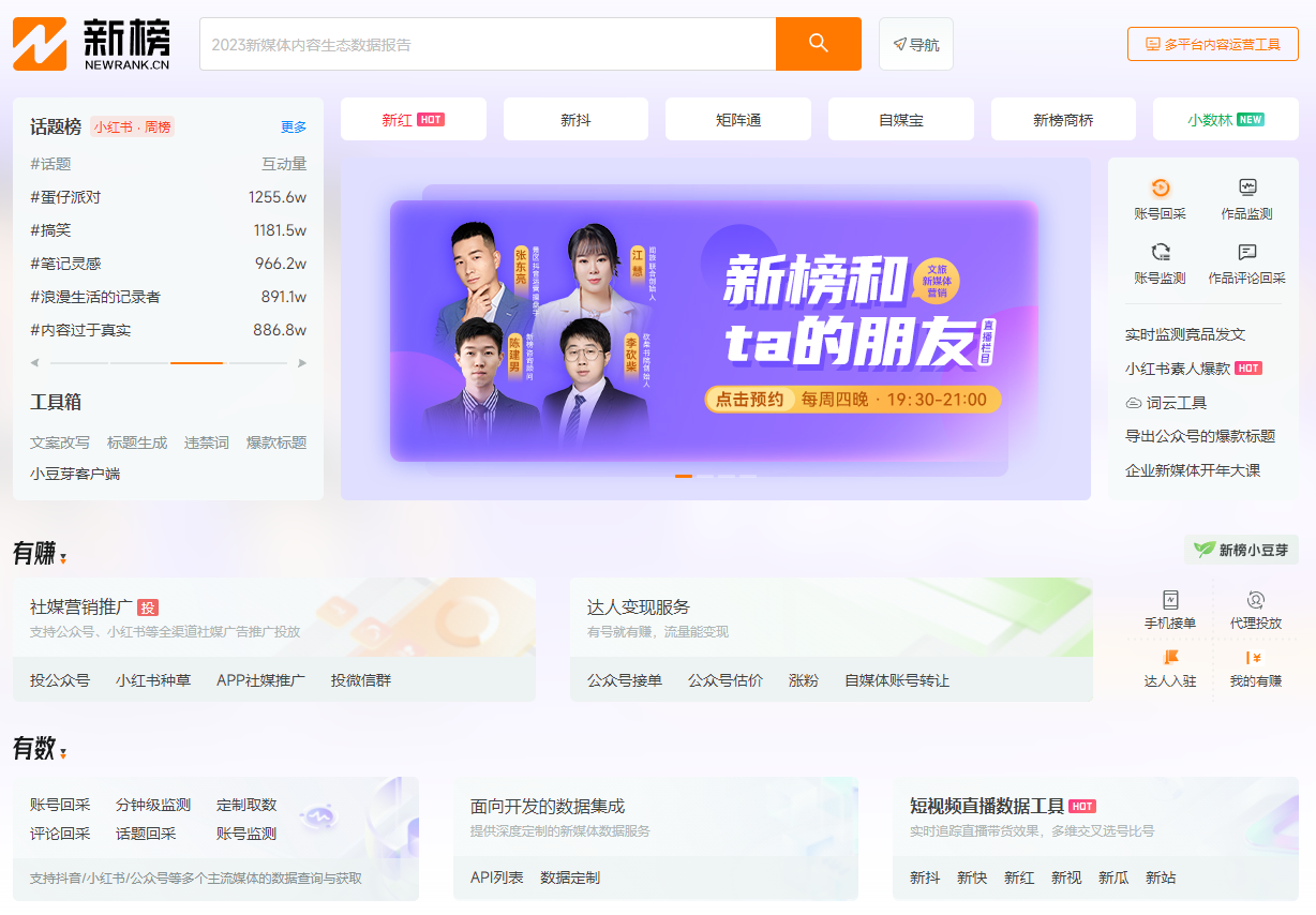 作为数据驱动的内容产业服务,新榜发挥行业枢纽作用,连接线上线下资源,提供内容营销、电商导购、用户运营、版权分发等产品服务,服务于内容产业,以内容服务产业。