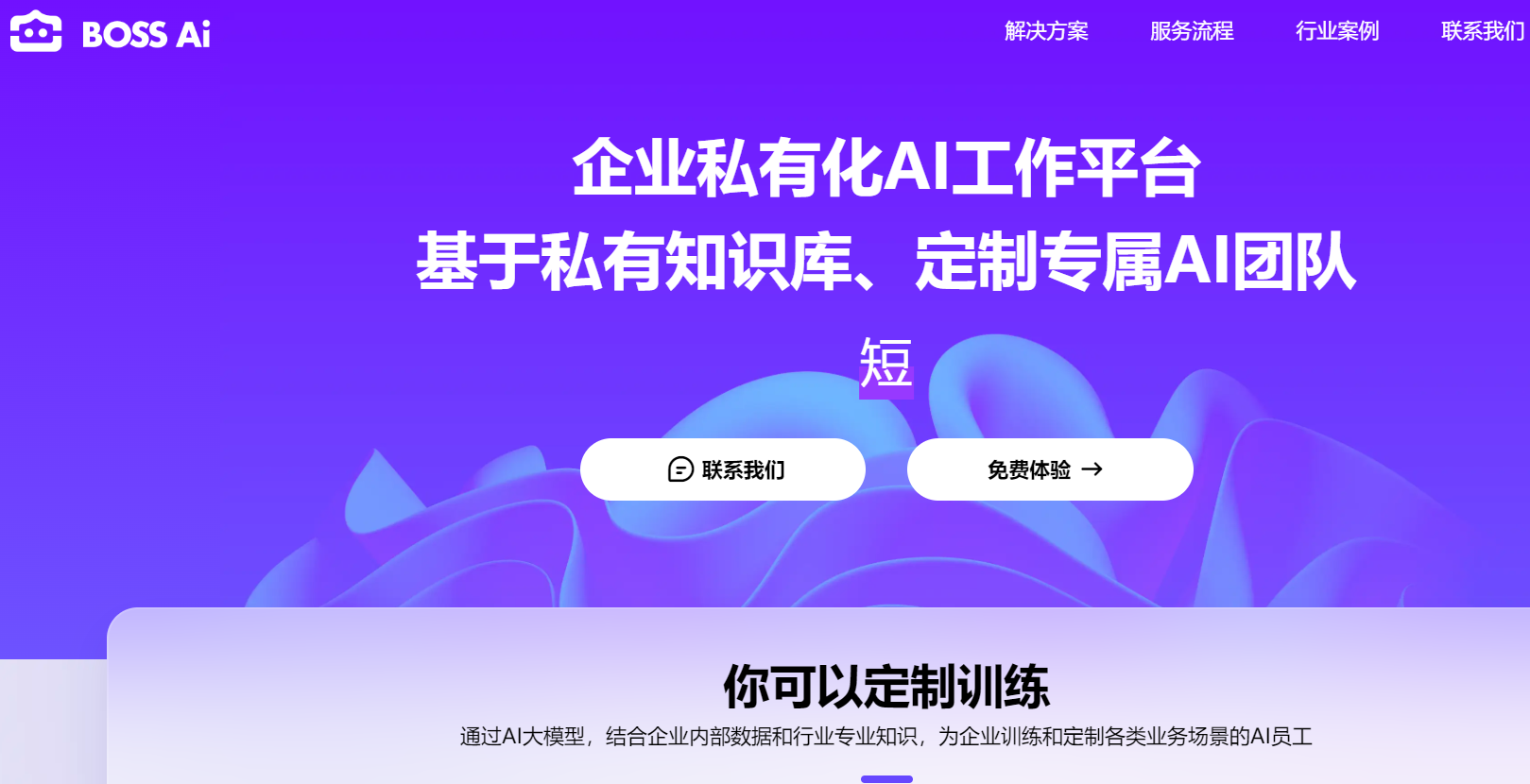 BOSSAI – 企业员工AI官网 AI专家等角色训练、实现AI员工 网站服务:AI专家,AI员工,企业AI员工平台。 基于企业私有数据训练专属AI大模型,定制专属AI团队,提供企业AI系统解决方案。支持部署App、网站、公众号、企业微信等第三方平台,降低企业人工成本提高经营效益