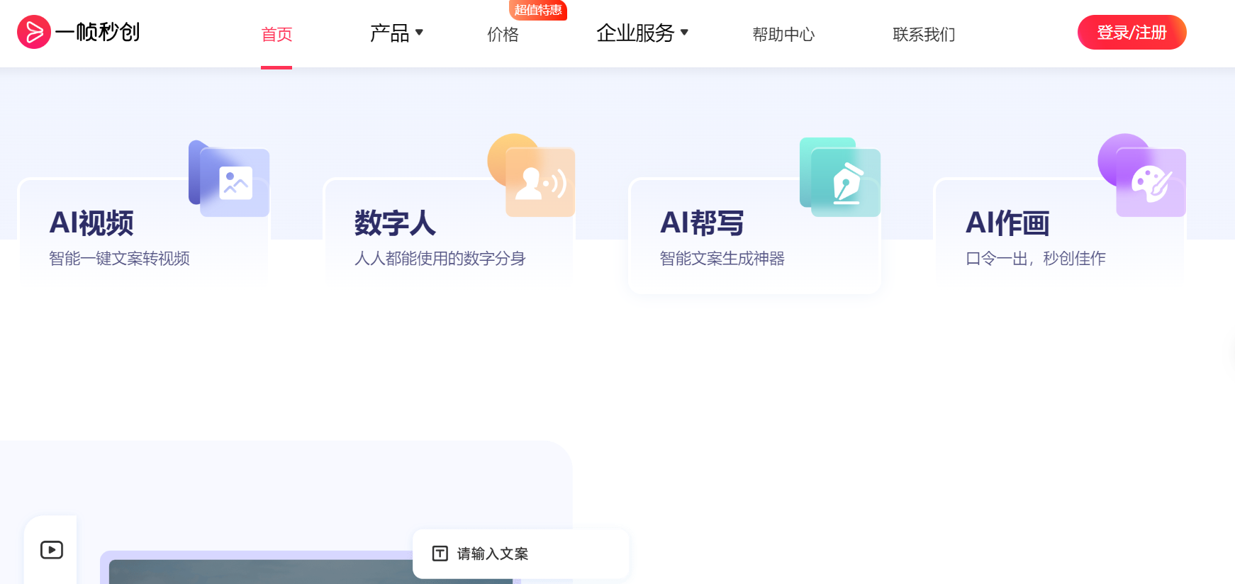 一帧秒创是基于秒创AIGC引擎的智能AI内容生成平台,为创作者和机构提供AI生成服务,包括文字续写、文字转语音、文生图、图文转视频等创作服务,一帧秒创通过对文案、素材、AI语音、字幕等进行智能分析,快速成片,零门槛创作视频。