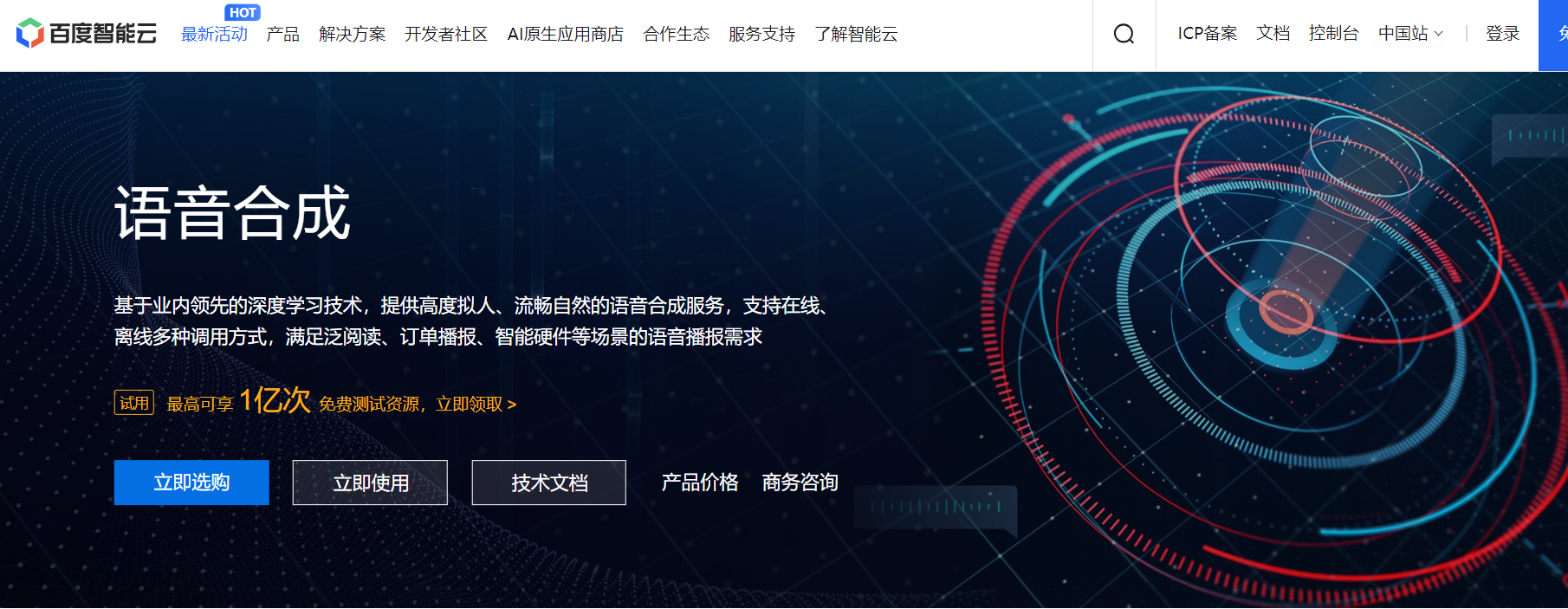 百度智能云语音合成是百度AI开放平台提供的一项语音技术服务,包括短文本在线合成、长文本在线合成、离线语音合成和定制音库四个产品。支持多语言多音色:支持中文、英文、中英文混读合成,提供基础音库和精品音库共19种音库供您选择,让您的产品拥有个性化的声音。
