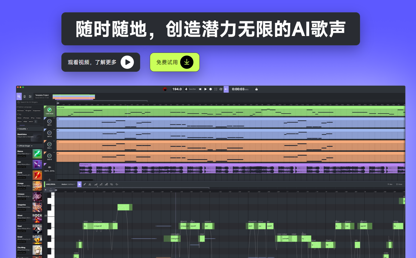 从流行到民歌、童声到摇滚…数十位精通中日英三语的高水平AI歌手为您尽其所能,满足全场景音乐制作需求。