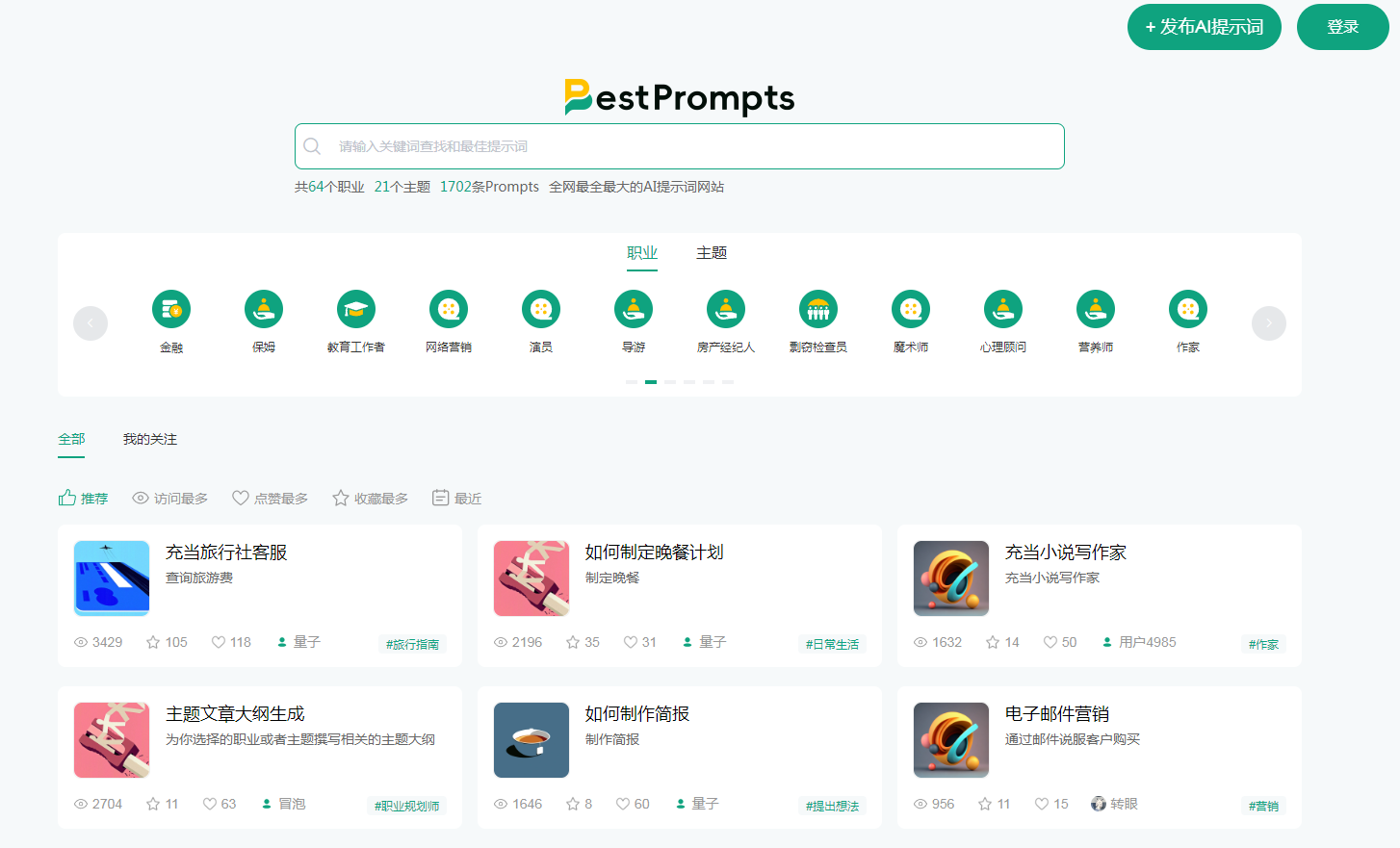 共64个职业\21个主题\1702条Prompts\全网最全最大的AI提示词网站。