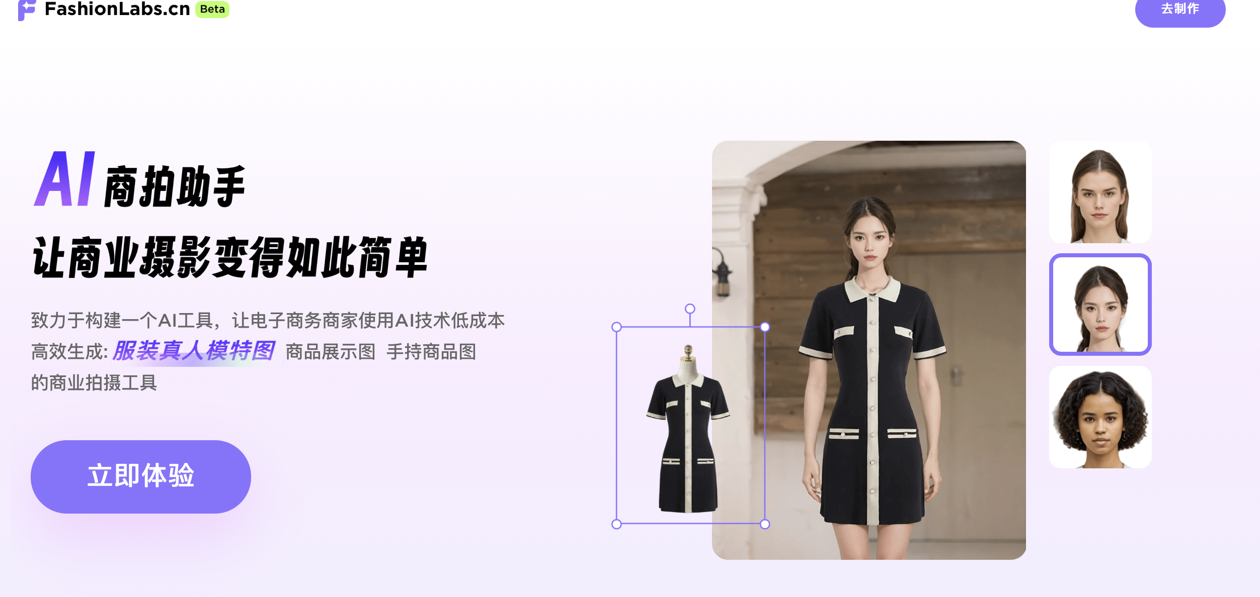 FashionLabs.cn 是由领先的AIGC公司研发的电商领域可商用的AI工具,我们的AI技术和 数字模特完美融合,为商家和品牌打造独特的商品图片。使用FashionLabs.cn告别模特,摄影,场地租 赁甚至昂贵的设备限制,利用强大的AI赋能,只需简单几步操作实现商拍自由,省时省力又省钱。