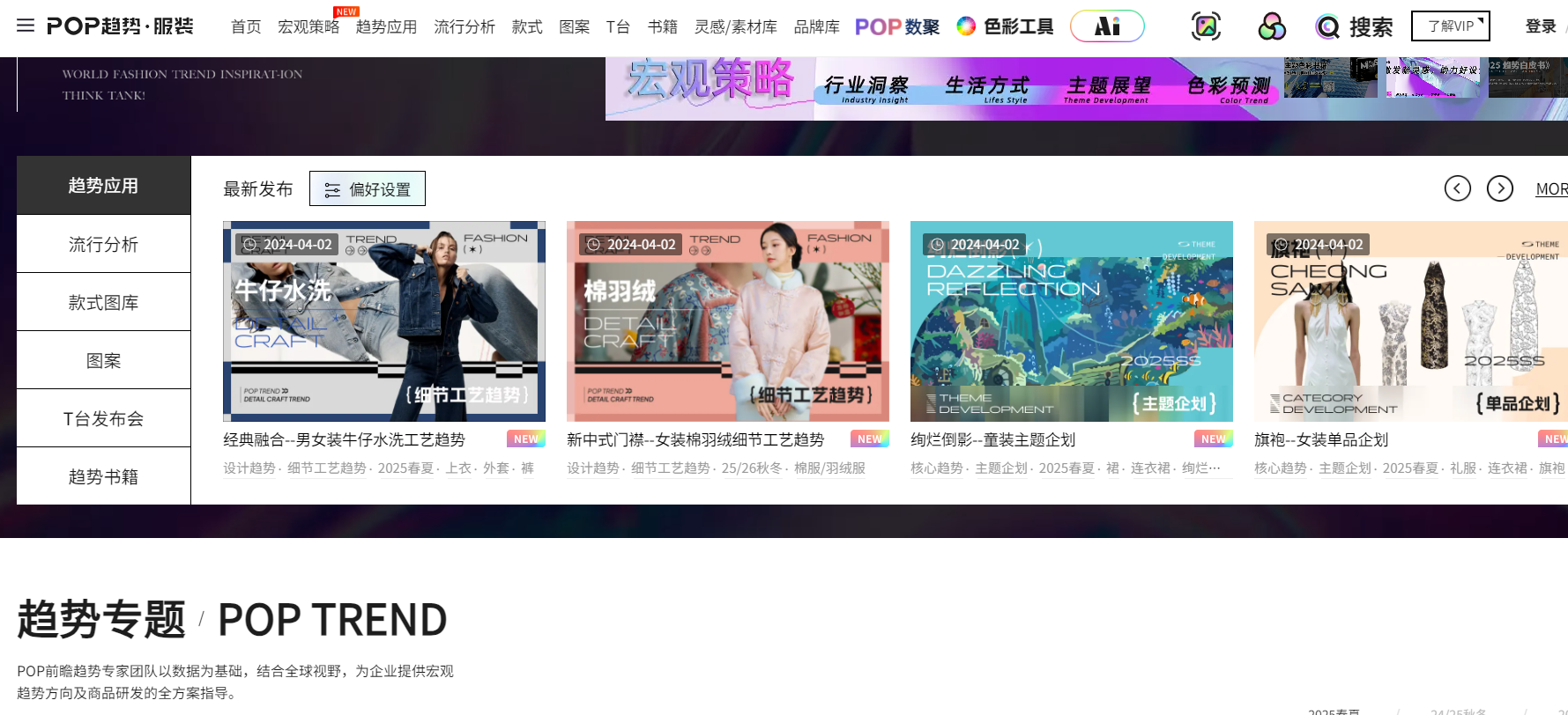 POP服装趋势网是一个专注于服装流行趋势预测和设计资讯的平台,致力于为服装设计师和企业提供最新的时尚趋势信息。网站提供宏观趋势方向指导、商品研发方案、设计作品保护、面辅料交易、产业地创新服务、时尚教育以及智能设计软件等综合服务。