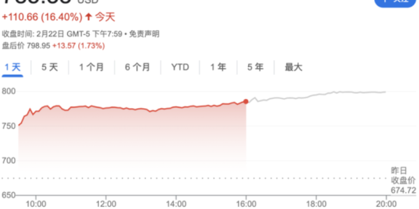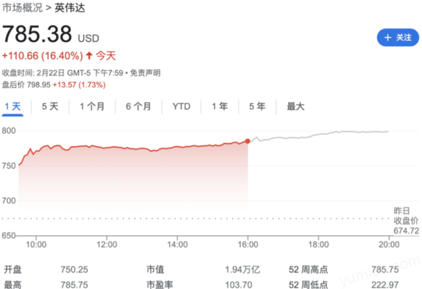 而在本周四收盘时,英伟达股价飙升16.4%,达到785.38亿美元;市值大涨2770亿美元,达到1.94万亿美元,创华尔街历史新高。该公司于周三晚间发布了第四财季业绩,公司营收达到221亿美元,较第三季度增长22%,较去年同期则大增265%;调整后每股收益为5.16美元,同比增长486%,均远高于分析师预期。