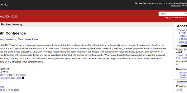 近日,一项名为“Deep Think with Confidence”(DeepConf)的研究成果在学术界引起了广泛关注。该研究提出了一种简单而强大的方法,能够在测试阶段显著提升大语言模型(LLMs)的推理效率和性能。DeepConf通过利用模型内部的置信度信号,动态过滤低质量的推理轨迹,从而在不增加额外模型训练或超参数调整的情况下,有效减少生成的token数量,同时提高推理的准确性。论文地址:https://arxiv.org/abs/2508.15260