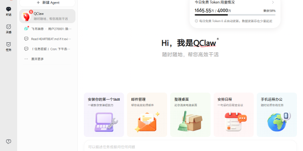 2、腾讯qclaw,总体来说可以,每天4000万token免费额度,省着点还是够用,可以试试。可以配置钉钉、飞书等。用起来反应较慢,复杂任务还是一步步来,不然容易卡死,但免费的也就将就吧!