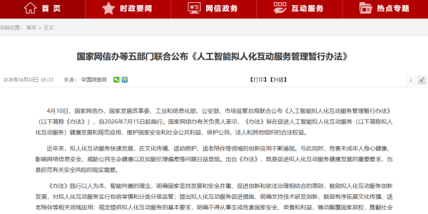 2026年4月10日,国家网信办、国家发改委、工信部、公安部、市场监管总局五部门联合发布《人工智能拟人化互动服务管理暂行办法》,明确禁止向未成年人提供AI虚拟伴侣等虚拟亲密关系服务,7月15日起正式施行。这是中国首部专门规范AI拟人化服务的部门规章。
