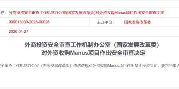 然而,仅仅一年之后,这家明星AI公司迎来了命运的转折。4月27日,国家发展改革委(外商投资安全审查工作机制办公室)正式对外资收购Manus项目作出禁止投资决定,要求当事人撤销该收购交易。这是《外商投资安全审查办法》2020年实施以来,首个被公开叫停的AI领域外资收购案,也是该办法框架下最严的一档审查结论——明文规定"对禁止投资的,不得实施投资"。